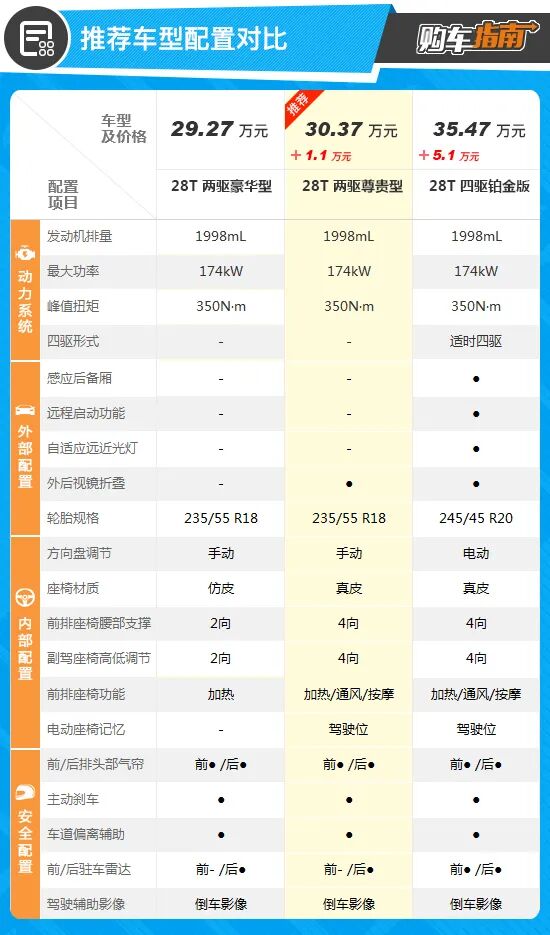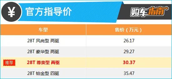而顶配版本与推荐车型相比,虽然增加了适时四驱系统以及多项舒适性配置,但差价也达到了5.1万元,考虑到适时四驱对于非铺装路面行驶的增益并不高,同时部分增加配置的日常使用率较低,所以如果对配置没有执着追求,则完全没有必要。综合来看,28T两驱尊贵型的性价比较高,在购车时可优先考虑。