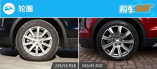 2022款上汽通用凯迪拉克XT4提供了两种尺寸的轮圈,顶配车型标配20英寸多辐式铝合金轮圈,镀铬饰面搭配扇叶造型,营造出运动与时尚兼备的效果。而其余车型则为18英寸铝合金轮圈,虽然造型设计相似,但整体质感不如顶配车型出彩。