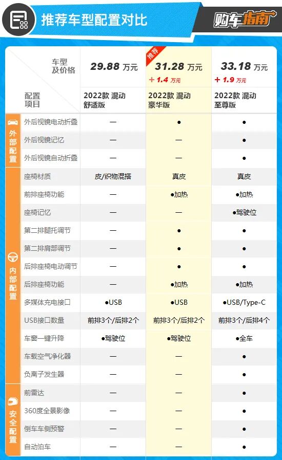 至于顶配车型至尊版,价格相比推荐车型贵了1.9万元,实际增加的配置比较有限,并且绝大多数属于锦上添花的功能。诸如自动泊车、驾驶位座椅记忆、外后视镜记忆等功能日常使用频率均较低,结合高达33.18万元的售价来看不太值得选购。因此,综合价格和配置因素,还是价格适中且舒适性功能齐全的豪华版性价比更高,在购买时建议优先考虑。