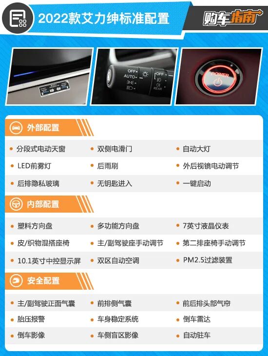 作为新款艾力绅的入门车型,经典版售价为27.98万元,价格成功控制在30万以内,同时整体配置也并不寒酸。除了前面提到的魔术感应门和双侧电滑门,入门车型还配备了较为实用的自动大灯、无钥匙进入+一键启动、自动空调等配置,满足日常用车需求完全没有问题。不过,入门车型在MPV潜在用户比较看重的舒适性和座椅功能方面存在明显不足,主要原因是采用了塑料方向盘、皮/织物混搭座椅,并且缺少了前后排电动座椅、座椅加热以及后排小桌板等功能,驾乘体验较为一般。此外,入门车型在日常使用频率较高的多媒体功能方面也有缺失。如果预算充足且对配置有较高要求,那么不建议大家选购入门车型。