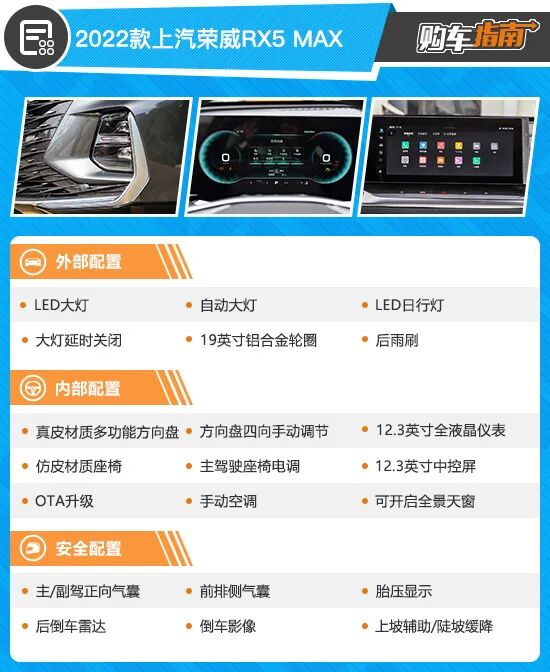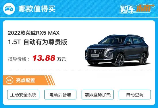 2022款荣威RX5 MAX入门车型为自动有为豪华版,售价12.98万元。车名中就带有“豪华”二字,而其配置表现也确实比较出彩。12.3英寸双联屏以及可开启全景天窗均为全系标配,再加上LED自动大灯、真皮材质多功能方向盘以及OTA升级等功能,满足日常使用其实并无压力。之所以不做推荐,主要还是存在性价比更高的选择,增加不多的预算就能换取很多实用配置。