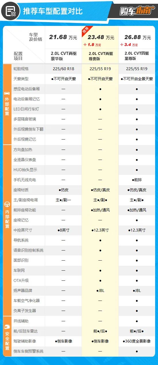 推荐车型较入门车型轮胎尺寸由18英寸升级至19英寸轮圈,视觉效果更加大气;配置上主要新增加了电动感应后备厢、LED日间行车灯、副驾驶电动调节、前排座椅加热/通风、JBL音响以及前/后驻车雷达等配置,而这些配置均为日常使用频率较高的配置,能够大幅提升乘客的用车感受,同时,中控屏也升级至12.3英寸,并且支持导航、语音识别控制以及OTA在线升级等,这些配置仅需多花费1.8万元即可获得,性价比极高。