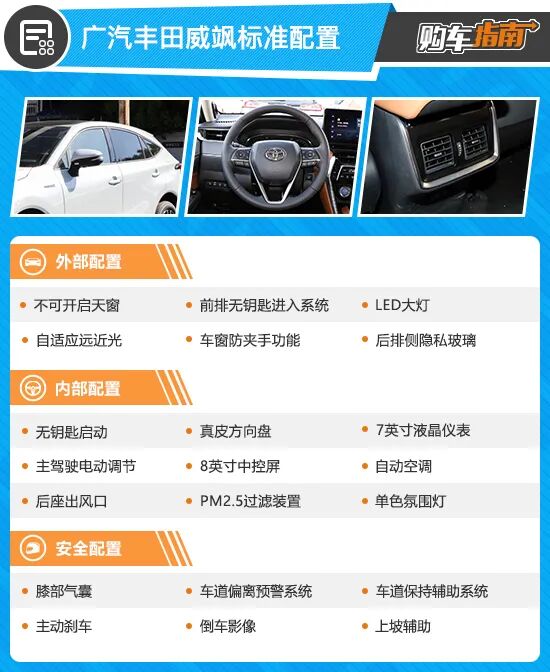 针对2.5L混动版本,各位小伙伴需要注意的是,2.0L版本的三款车型配置表现与2.5L版本的三款车型是一模一样的,所以同样推荐双擎 2.5L CVT两驱尊贵版。这套2.5L混合动力系统主要优势在于动力响应较快、后期用车成本降低、静音性会更好。至于是选择燃油车还是混合动力车型,还要看您个人需求。综合来看,如果您正在关注广汽丰田威飒车型,那么2.0L和2.5L两款动力版本的尊贵版值得您优先考虑。