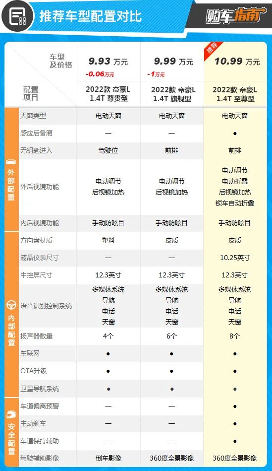 通过配置对比分析,我们推荐的是售价10.99万元的至尊版车型,也是顶配车型。相比次顶配旗舰版,只多了1万元,但是在配置方面可以说是全面升级。尤其是在智能驾驶辅助和安全配置方面,有了很大升级。在驾驶辅助方面,从定速巡航升级到了全速自适应巡航系统,实用性更强。在安全配置方面,增加了车道偏离预警系统、车道保持辅助系统、道路交通标识识别以及主动刹车系统,安全性得到了极大提升。从科技娱乐配置方面来看,推荐车型增加了10.25英寸的全液晶仪表,不仅呈现的信息很丰富,而且全彩显示带来了更为高端的体验。在舒适性配置方面,推荐车型增加了主驾驶座椅电动调节、前排座椅加热功能,座椅材质也升级为皮质与翻毛材质混搭,高级感和舒适性都得到了不小的提升。在实用性和便利性方面,推荐车型增加了自适应远近光灯,外后视镜功能上也多了电动折叠和锁车自动折叠功能,对于日常使用提供了更多便利。综上所述,我们推荐的顶配版至尊版车型可以说在配置方面已经非常全面,而且只多出了1万元,可以说性价比非常高。如果您正在关注吉利帝豪L,那么至尊版值得您优先考虑。
