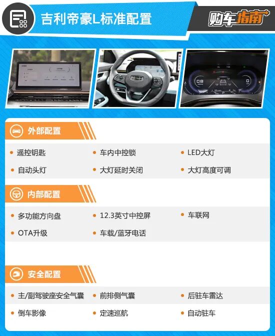 帝豪L入门版车型为尊贵型,售价9.93万元。配置虽然说不上丰富,但是也基本满足日常需要。一些普通的配置就不说了,来说一下重点的配置。前排的头部、侧气囊,属于被动安全,都有配备。不到10万元车型里面,这个配置算是合格。辅助驾驶功能有后部的泊车雷达、倒车影像、定速巡航、自动驻车。这些功能可以为日常的驾驶带来一定程度的便利性。舒适性配置方面,一键启动、自动大灯、12.3英寸中控屏、自动空调等,满足一般家庭用车,提供足量的舒适度。如果您的购车预算有限,同时也比较注重安全品质的话,入门车型基本可以满足用车需求。当然,这并不是最优选择,至于原因,咱们继续往下看。