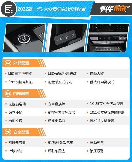2022款一汽-大众奥迪A3入门的进取版车型配置表现非常全面,不过为了区分高低配车型,座椅材质依然为织物,且没有配备天窗、主动安全系统、全速自适应巡航等功能,而这些功能大部分在老款车型上可以通过选装获得,但新款车型却取消了选装选项,这也成为不推荐入门版车型的主要原因。