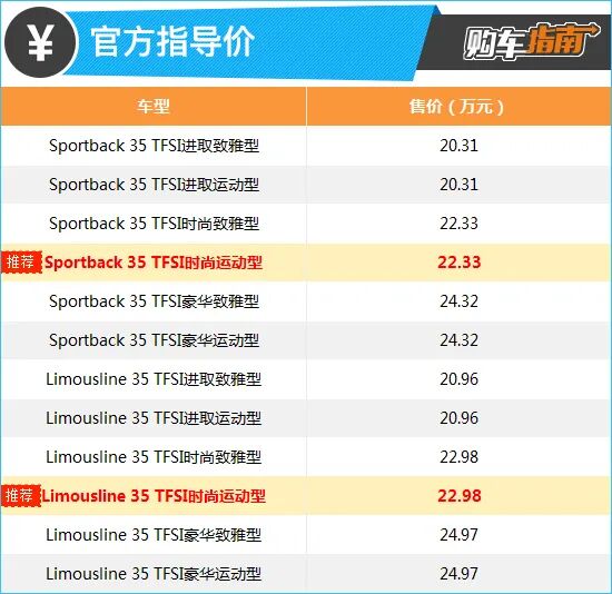 2022款一汽-大众奥迪A3共推出12款车型,售价区间为20.31-24.97万元。新车分为两厢的Sportback版与Limousline三厢版,并提供致雅型和运动型两种外观风格,每种风格提供三种配置不同的车型版本。动力总成方面,全系均为1.4T发动机+7速双离合变速器的动力组合。接下来我们就将针对车型间的配置差异,为您来推荐哪款车型的性价比最高。