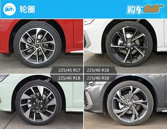 2022款一汽-大众奥迪A3入门的进取型,无论两厢还是三厢,均配备17英寸轮圈,轮胎具体尺寸为225/45 R17。而其余车型则为18英寸轮圈,并且根据不同车型配置还提供了多种样式选择和颜色搭配,具体轮胎尺寸为225/40 R18。