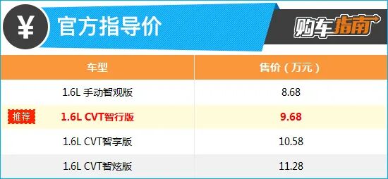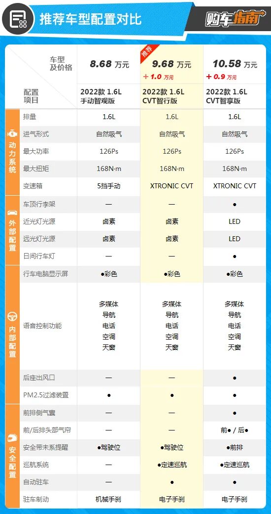 三款搭载CVT变速箱的车型中,编辑重点推荐1.6L CVT智行版,售价相比入门车型多出了1万元,得到了日产XTRONIC CVT变速箱,同时配置方面还增加了定速巡航和自动驻车两大实用性功能,并且升级到了电子手刹。虽然推荐车型在被动安全、灯光系统方面表现仍不完美,但是考虑到其不到10万元的价格,以及高配两款车型相对有限的配置提升幅度,因此1.6L CVT智行版不失为合理的选择。