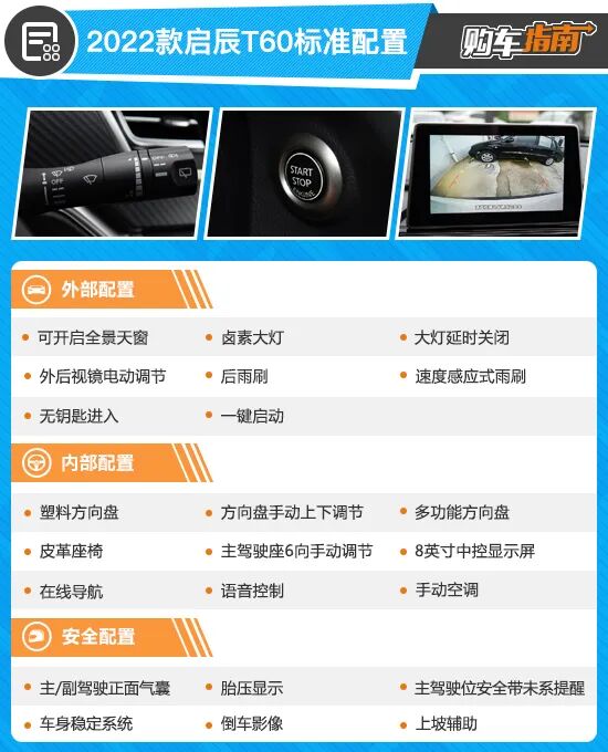 1.6L 手动智观版是2022款启辰T60全系的入门车型,也是唯一一款配备手动变速箱的车型。从配置来看,入门车型整体表现基本达到了预期,特别是在日常使用频率较高的便利性和多媒体配置方面,提供了无钥匙进入+一键启动、多功能方向盘、8英寸中控触控屏、在线导航、智能语音控制、速度感应式雨刷等功能,能够满足日常使用需求。不过,考虑到手动变速箱不利于城市拥堵路况驾驶,结合其8.68万元的售价,综合性价比优势不大,故不做重点推荐。