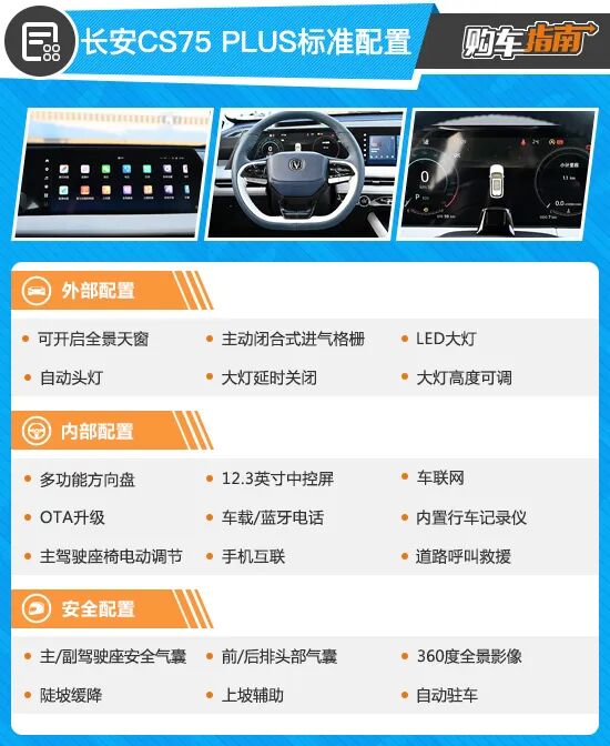 第二代长安CS75 PLUS入门车型为售价12.49万元的1.5T豪华版,虽然是入门版车型,但是配置并不寒酸。首先,在内部配置上,就已经配备了12.3英寸液晶以及12.3英寸的中控屏,同时还车联网、OTA升级以及车载行车记录仪和手机互联等;外部配置上,入门版车型就已经配备了LED大灯组,主动闭合式进气格栅以及开启的全景天窗和自动头灯等,可以说在同级别中都是很少见的。最后是安全配置,入门版车型配备了360全景影像、前后排头部气囊以及上坡辅助和陡坡缓降功能,可以说满足日常需要完全没有问题。不过作为入门车型,在驾驶辅助方面还是有所缺失,这也符合入门版的定位。所以如果您购车预算有限,入门版车型已经足够使用,但是要是最佳选择,我们还是推荐1.5T 领航型。