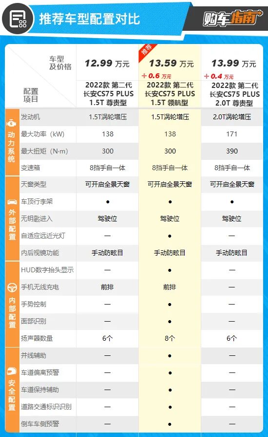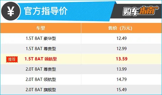 纵观全系车型,显然售价13.59万的1.5T领航型更加值得推荐。相比低一级别的1.5T尊贵型,推荐车型只贵了0.6万元,但是配置上可以说有了质的变化,尤其是在驾驶辅助和智能科技配置上,更加全面。首先来看驾驶辅助方面,推荐车型增加了并线辅助、车道偏移预警以及道路交通识别系统,此外还增加了倒车车预警功能,可以说安全辅助方面已经非常的全面了。再来看智能科技层面,推荐车型相比尊贵版车型增加了 HUD数字抬头显示系统、人脸识别以及手势控制等功能,灯光功能方面增加了自适应远近光灯等主流科技配置,整体提升了一个档次。相比推荐车型,我们再来看看2.0T的入门车型尊贵型,售价上贵了0.4万元,除了升级为2.0T动力系统外,配置上与推荐车型相差很多,甚至像手机无线充电、蓝牙钥匙以及座椅加热这些1.5T入门版车型都有的配置,在这款车型上都没有见到。因此如果您不是对2.0T动力有硬性要求的话,还是不推荐买这款车型。如果您的购车预算充足,同时对动力有比较高的要求的话,也可以考虑更高配置的2.0T领航型,除了动力升级外,配置也和推荐车型基本相同。因此经过综合对比,我们还是向您推荐1.5T领航型,它的配置最为全面,价格也相对合适,是6款车型中性价比最高的一款,建议购买时优先考虑。