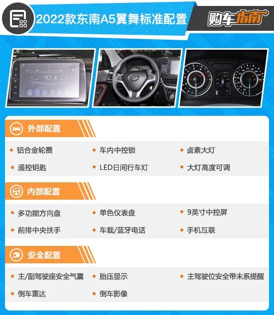 2022款东南A5翼舞共推出7款车型,售价区间为5.79-11.99万元。此次变化主要是取消了入门的1.5升手动翼尚版车型,新增了一款售价为11.99万元的翼钻型车型,这是一款网约车定制版,新车入手门槛从5.29万元提高到5.79万。除去顶配的网约车定制版车型,其余6款车型如何选择?哪款性价比最高呢?今天我们就从购车指南的角度,来看看2022款东南A5翼舞如何选购。