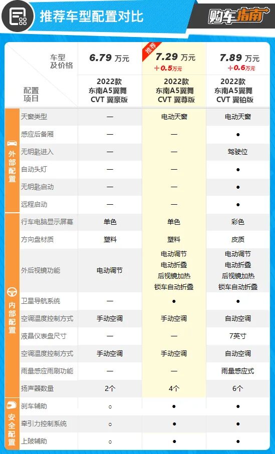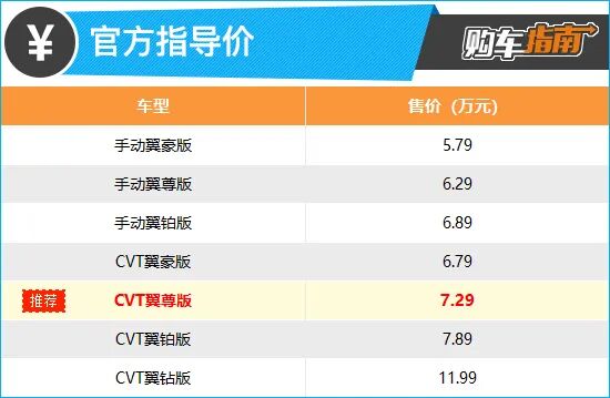纵观全系车型,显然售价7.29万的CVT翼尊版最值得推荐,首先它是自动挡车型,这也是目前大多数消费者的主流选择,其次,相比低一级别的豪华型,推荐车型只贵了5000元,不过这5000差价在配置上可以说是有了质的飞跃。尤其是在驾驶辅助还有便利性和智能配置方面。