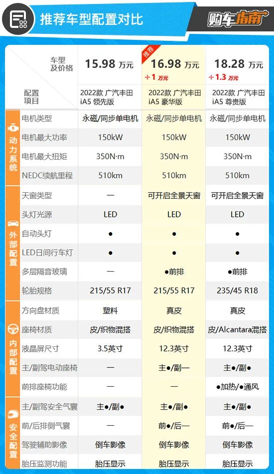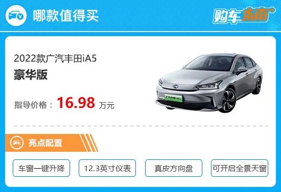 而对于高一级别的尊贵版车型,在推荐车型基础上升级了尺寸更大的18英寸轮圈,同时还加入了前排手机无线充电、前排座椅加热/通风、副驾电动座椅、车内氛围灯、驾驶席电动座椅记忆以及前后排头部气帘等功能,这些进阶型配置虽然只需要再花费1.3万元,但这也导致尊贵版车型售价达到了18.28万元,对于一款紧凑型纯电轿车来说,这样的价格显然已经不具备任何性价比优势。因此,综上所述,如果您近期想购买2022款广汽丰田iA5,那么豪华版车型相对性价比更高,在购车时可优先考虑。