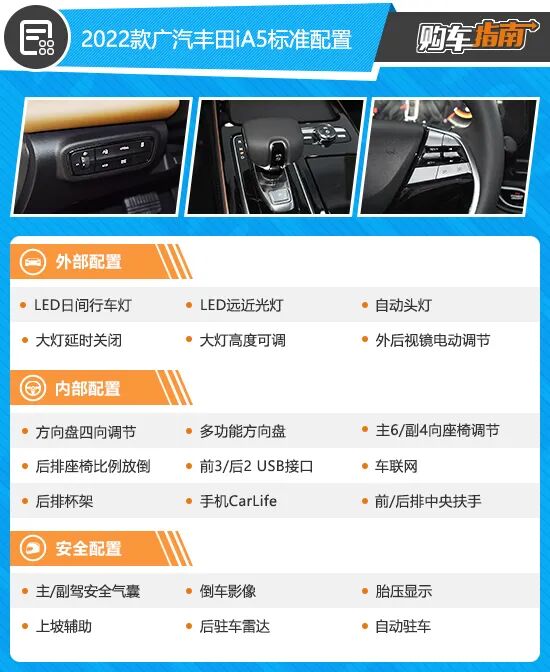 2022款广汽丰田iA5入门车型整体配置并不高,与其它车型相比,差异主要体现在一些功能性配置上。首先,在外观部分,入门车型缺少了国人最喜爱的可开启全景大天窗,不过好在其它部位都有没有太大差异,全系标配了LED远近光灯、LED日间行车灯以及电动外后视镜等。