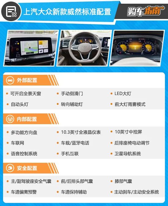 纵观全系车型,显然售价30.68万的330TSI豪华版最值得推荐,虽然相比入门商务版的指导价要高2万元,不过增加的配置可以说是质的飞跃,外部配置上升级为19英寸轮圈,还有双侧电滑门和电动感应尾门等配置。智能科技配置上,从推荐车型开始配备12英寸中控屏、10色氛围灯、手机无线充电、全速自适应巡航、真皮方向盘、真皮座椅、前排座椅电动调节及加热功能,相信选择购买新款威然的消费者,不会拒绝多花这2万元来获得以上这些配置。19英寸轮圈能让车辆更显高档,增加的诸多配置也能满足日常对舒适性及便利性的常规需求。
