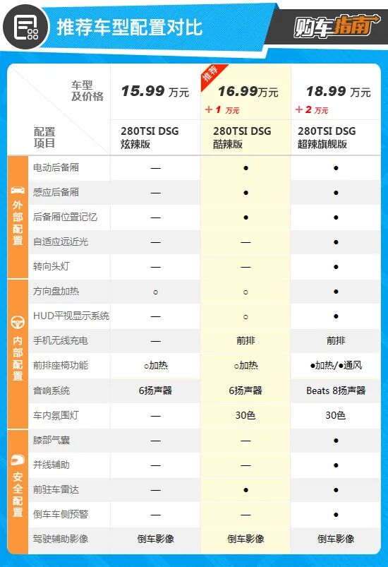 购买高端紧凑型车的消费者更注重舒适性配置的丰富性,所以诸如可感应开启的电动尾门、前排手机无线充电、30色车内氛围灯等功能就显得尤为重要。如此看来,酷辣版就显得比较合适了。虽然与超辣旗舰版相比,推荐车型少了很多高阶配置,但已经能满足大部分年轻消费者对于时尚和高级感的需求。并且包含方向盘加热和前排座椅加热的“辣选加热套组选装包”以及“W-HUD抬头显示选装包”仅该版本车型可选,消费者可以用更实惠的价格选择适合自己的配置。