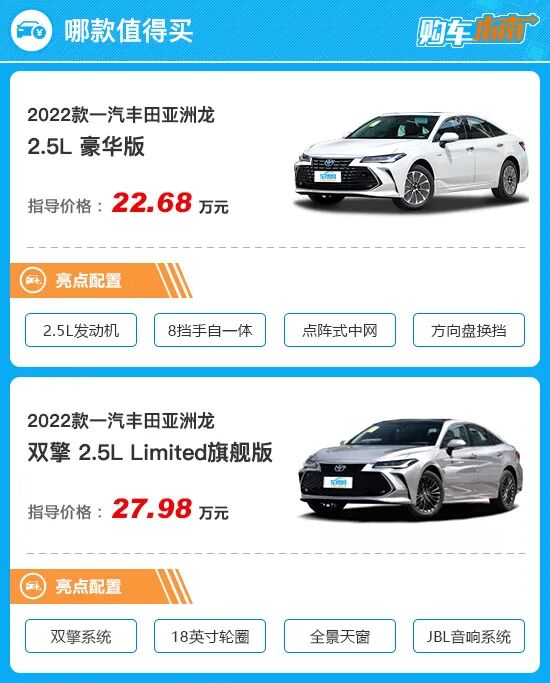 综上所述,对于2022款一汽丰田亚洲龙的购买意见,首推售价为22.68万元的2.5L豪华版,消费者在选择时可以优先考虑。当然,如果预算充裕,那么售价为27.98万元的2.5L双擎Limited旗舰版也同样非常值得选购。