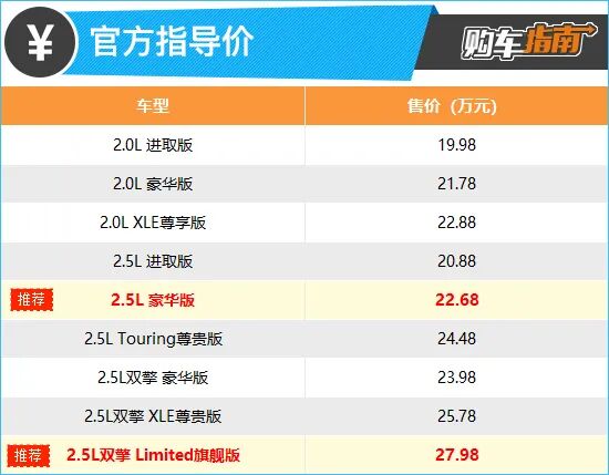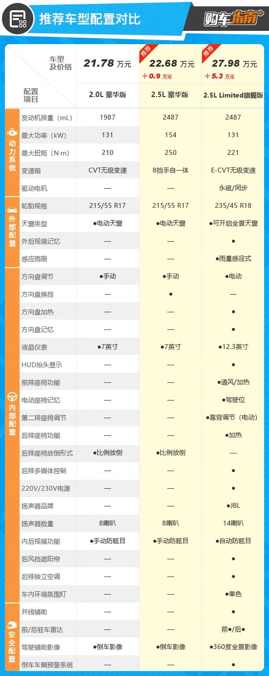 推荐方面,个人首推2.5L豪华版,售价22.68万元。这个配置车型搭载2.5L自然吸气发动机,传动系统匹配8挡手自一体变速箱,动力更加充沛。配置方面,虽然推荐车型与2.0L豪华版车型在配置方面几乎保持一致,但是用0.9万元换取一套表现更佳的动力总成,个人感觉相当划算。当然,我也并不是说2.0L版本的车型就不能选,如果是对动力没有任何需求,只是追求经济实惠,那么入门版本的2.0L进取版也未尝不可,这点还是需要因人而异。