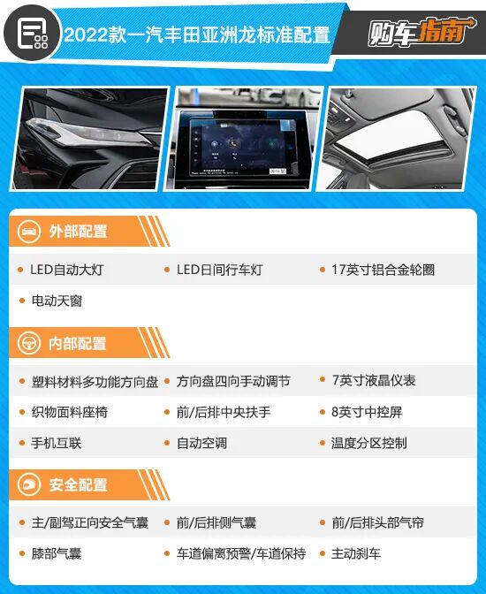 2022款一汽丰田亚洲龙入门版车型为2.0L进取版,售价19.98万元,价格不算贵,配置表现也中规中矩。其实就日常家用而言,入门版车型的性价比并不低,基础配置并不寒酸,例如LED自动大灯、电动天窗、多功能方向盘、7英寸液晶仪表、8英寸中控屏以及自动空调等,此外其还拥有丰富的主动安全系统。不过之所以不做推荐,主要还是因为这个级别的车型,对于配置的要求真不能太低,而且2.0L+CVT的动力总成也实在是有些太过“无欲无求”。只要不是预算太过紧张,那么入门版本的亚洲龙都绝对称不上是最佳选择。