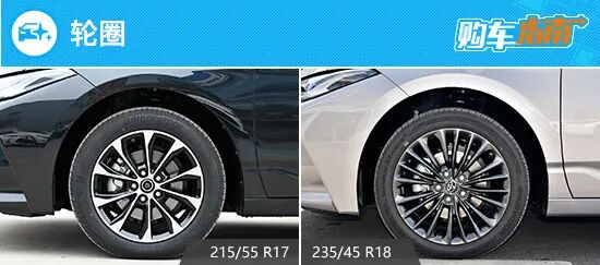 2022款一汽丰田亚洲龙提供两种尺寸轮圈,中低配车型使用双五辐式铝合金轮圈,造型简约时尚,轮胎尺寸为215/55 R17。虽然尺寸不大,但好在看上去还算协调,比较中规中矩。高配车型配备枪灰色多辐式轮圈,视觉效果沉稳大气,营造出很强的豪华感,轮胎尺寸也升级为235/45 R18。