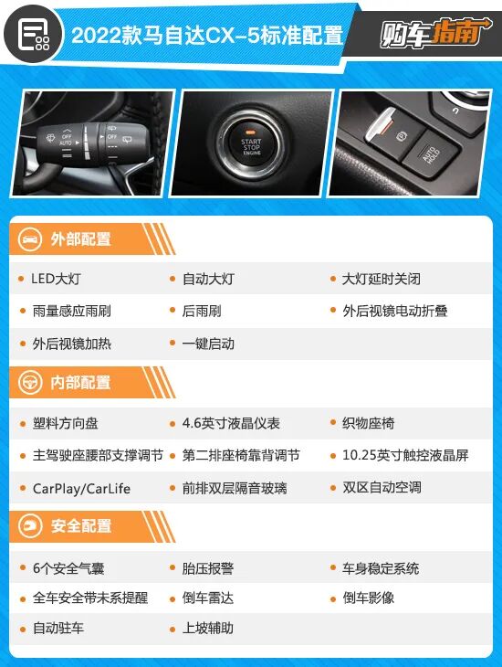 配置方面,2022款马自达CX-5全系标配马自达悦联系统,支持无线CarLife/CarPlay。除入门车型外,其余车型还提供了BSM盲点监测系统、RCTA倒车预警系统等、另外高配车型还配备了MRCC全速域自适应巡航系统、CTS巡航模式智能行车辅助系统等。
