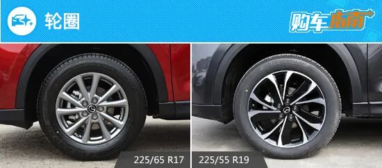 2022款马自达CX-5全系提供了两种尺寸的轮圈,其中2.0L车型采用17英寸多辐铝合金轮圈,样式较为普通,搭配规格为225/65 R17的轮胎;而2.5L车型采用19英寸双色旋风铝合金轮圈,样式更加运动,搭配规格为225/55 R19的轮胎。