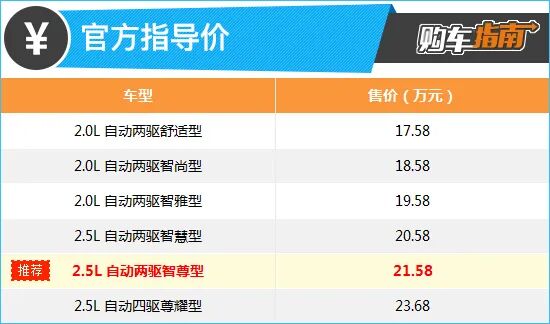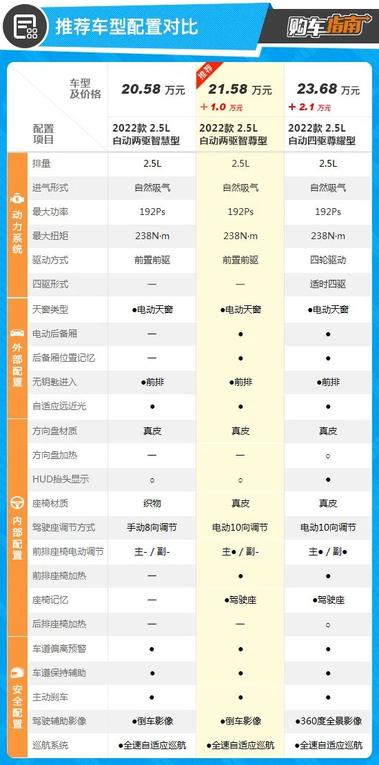 三款2.5L车型补齐了2.0L车型在驾驶辅助配置上的短板,同时搭载了性能更强的2.5L动力,可以提供更安全更可靠的驾驶体验。综合比较之下,编辑认为2.5L自动两驱智尊型更值得推荐。与2.0L顶配车型对比来看,推荐车型售价仅高出2万元,配置方面不仅增加了车道偏离预警、车道保持辅助、主动刹车、全速自适应巡航等,还升级为19英寸轮圈以及2.5L动力,可谓物超所值。