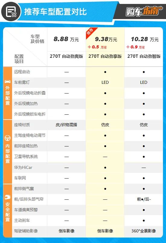 通过对比不难发现,推荐的270T自动劲享版比低一级的270自动劲爽版配置高出不少,既有关乎舒适性的主驾驶座椅电动调节、前排座椅加热以及多功能的外后视镜等功能,同时在安全性方面也增加了前排侧气囊,且两者差价仅为5000元,还是物超所值的。而与顶配的270T自动劲智版相比,后者主要增加了主动安全和智能车机两大项功能,其中主动安全仅提供车道偏离预警和自动刹车,像车道保持辅助和并线辅助功能并没有包含在内,且也不支持全速域自适应巡航,仅为定速续航,所以其实没必要花费9000元升级到顶配版本。