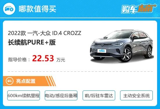 综合配置信息,向您推荐2022款一汽-大众 ID.4 CROZZ 长续航PURE+版车型。作为一款次低配车型,推荐车型相比入门车型增加了2万元,但整体配置其实差距并不大,主要体现在动力和续航里程上,其他的配置仅相差了电动/感应后备厢。不过,推荐车型600km的理论续航要比入门级车型的425km续航多不少,已属于当下主流,消费者不用担心续航和频繁充电的焦虑。尤其是进入冬季,电瓶受低温环境影响较大,入门级车型理论上的425km续航恐怕会让车主怀疑人生。所以对比而言,600km的长续航PURE+版车型明显要更加靠谱一些。