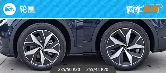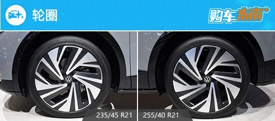 轮圈部分,2022款一汽-大众 ID.4 CROZZ总共提供了4种不同规格的轮圈,其中,入门级车型前后轮圈规格均为235/55 R19,而次低配车型前轮圈与其保持一致,后轮圈规格为255/50 R19。(由于这两款配置车型暂未到店,轮圈具体造型暂时无法知晓)