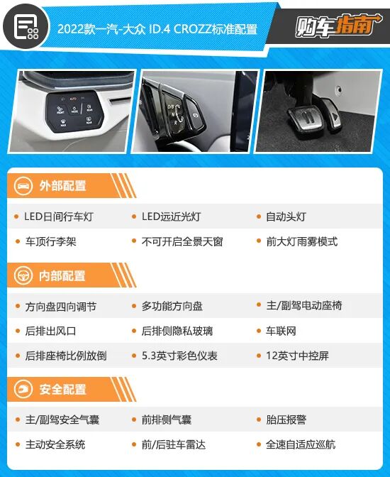 整体来看,2022款一汽-大众 ID.4 CROZZ入门车型整体配置表现还算不错,不过我们忽略了一个很重要的问题,入门级车型最大续航为425km,虽然理论上可以满足一般日常代步通行,但频繁充电日久天长也是一件麻烦事。所以,入门级车型虽然配置表现不错,但由于续航较短,因此不做优先推荐。
