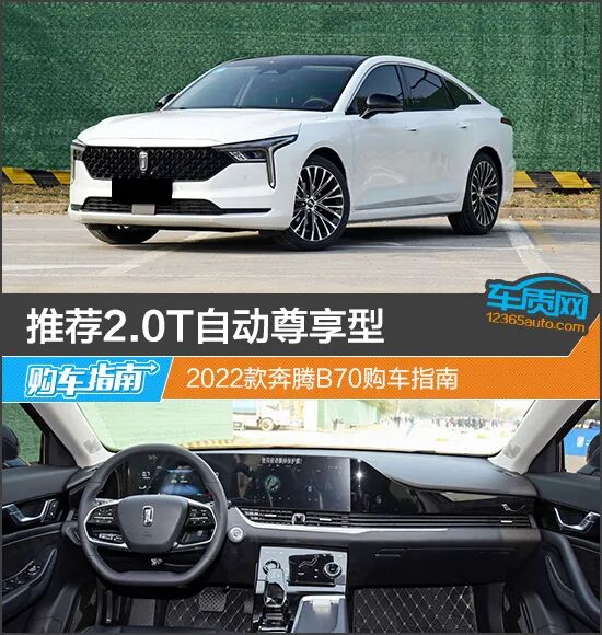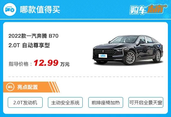 在配置方面,推荐车型与1.5T自动尊享版配置相同,均提供丰富的主动安全系统、可开启全景天窗、电动后备厢、前排座椅加热、远程启动、雨量感应式雨刷以及自适应远近光灯功能,大幅提升了舒适性体验。而更高一级的2.0T自动智享型比推荐车型增加了前排手机无线充电、单色车内环境氛围灯、并线辅助以及倒车车侧预警等几项功能,提升不大,也没有增加刚需配置。所以综合来看,2022款一汽奔腾B70 2.0T 自动尊享型性价比更高,购车时可优先考虑。
