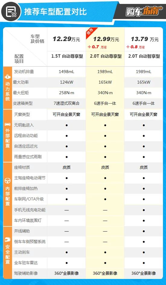 不选择入门版车型除了舒适性配置低之外,另一个主要原因是其匹配了7速双离合变速箱,虽然是湿式双离合,但无论是平顺性还是稳定性,均不如6速手自一体变速箱表现好。不过6速手自一体变速箱仅与2.0T涡轮增压发动机搭配,好在搭载2.0T发动机的入门版自动尊享型,也就是此次推荐车型的价格并不是很贵,接受起来难度较小。