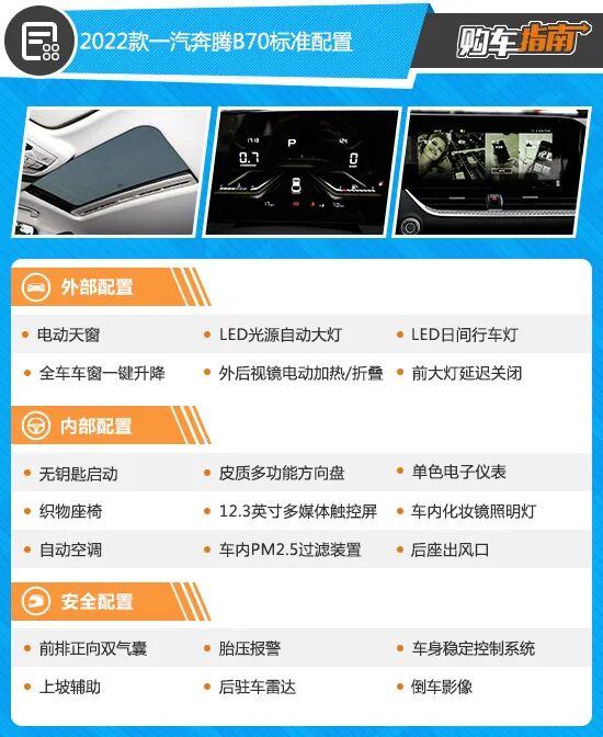 2022款一汽奔腾B70入门的1.5T自动乐享型基础功能较为全面,可以满足简单的家用所需。但考虑中型车目标消费者对于舒适性配置比较看重,再结合该车较高的性价比,显然中高配车型更为适宜。