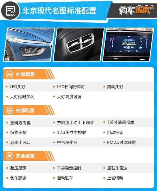全新名图入门版车型基础配置较为齐全,诸如LED头灯、LED日间行车灯、12.3英寸中控屏、自动空调、后座出风口、后驻车雷达以及倒车影像等配置均有所配备,但是其在舒适性和便利性配置方面稍有缺失,比如仅配备了塑料方向盘,并且方向盘只支持上下调节,座椅也仅支持手动调节。不过综合来看,全新名图入门版车型在同价位车型当中还是具备一定竞争力,但是考虑到作为一台家用车,配置略显寒酸,所以小编在此不向您推荐入门版车型。
