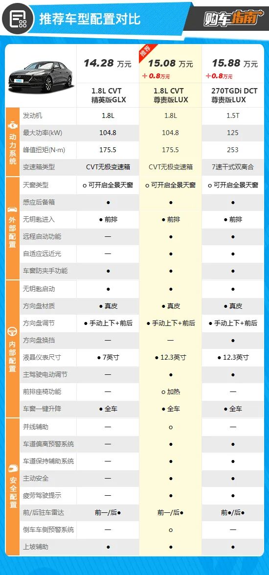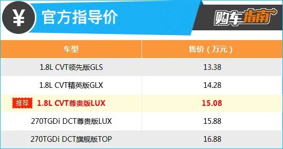 综合配置来看,小编向您推荐1.8L CVT尊贵版LUX,即1.8L顶配版。推荐车型较低一级别车型外部多出远程启动功能和自适应远近光两项功能,提升了日常便利性和安全性。内部则多出了主驾驶电动调节功能,并且提供主驾驶座椅加热配置的选装,同样提升了日常便利性,同时,液晶仪表盘尺寸由7英寸升级至12.3英寸,科技感有所提升。最为主要的是,推荐车型在安全方面更加厚道,其较低一级别车型多出了车道偏离预警系统、车道保持辅助系统、主动刹车以及疲劳驾驶提示等主动安全配置,并且还提供倒车车侧预警系统选装,这对于家用车来讲,无疑更加安心与贴心,而售价仅多出8000元,可谓非常划算。