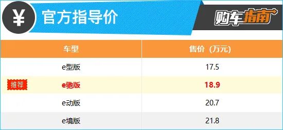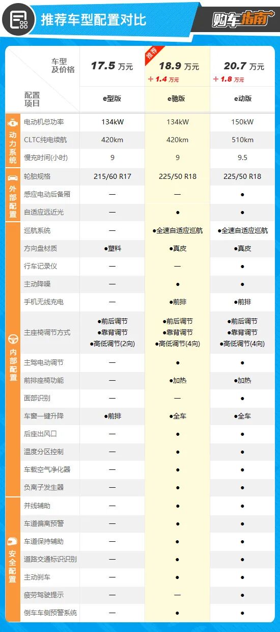 通过配置对比来看,小编向您推荐e驰版。推荐车型较入门车型外部多出了自适应远近光,提升了夜间行车安全性,并且轮胎尺寸由17英寸升级至18英寸,视觉效果更加大气。同时还新增加了全速自适应巡航、真皮方向盘、主驾驶座椅电调、座椅加热、后座出风口以及车载空气净化器等配置,这些都是日常使用频率较高的配置,舒适性和便利性都有所提升。此外,新车还增加了并线辅助、车道保持辅助、主动刹车以及车侧预警系统等安全配置,大幅提升了行车安全性,而售价虽然多出了1.4万元,但还是物有所值的。