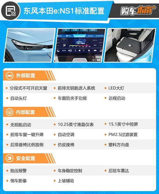 从配置来看,本田e:NS1的入门车型配置表现并不低,诸如10.25英寸液晶仪表、15.1英寸中控屏、无钥匙进入/启动、分段式不可开启天窗、自动空调以及倒车影像等均为标配,相比本田燃油系列车型要厚道多了,不过17.5万元的起售价也要更高一些。作为家用来说,入门车型的配置表现只能说够用,但舒适性和便利性配置略有缺失,因此不作推荐。