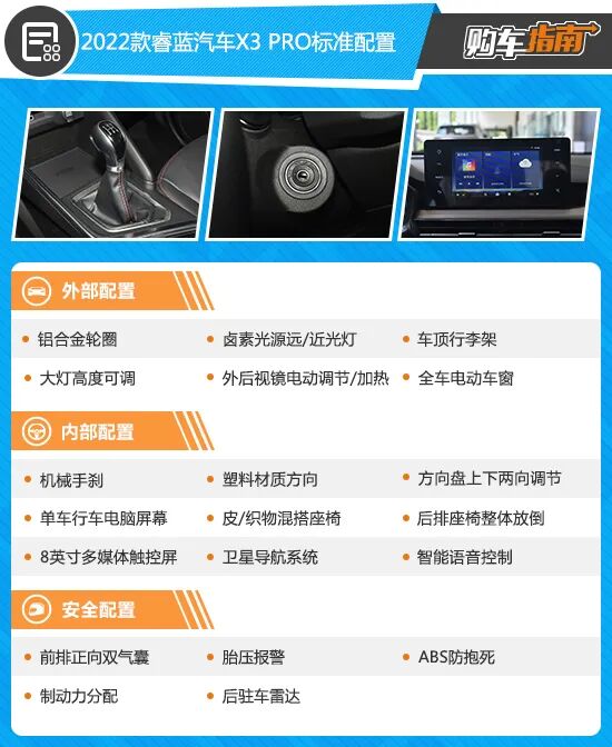 2022款睿蓝汽车X3 PRO入门的1.5L 手动小舒版本其实基础功能比较全面,虽然舒适性功能差了些,但像铝合金轮圈、后视镜加热、带有智能语音识别控制和在线导航的8英寸多媒体触控屏以及后驻车雷达等功能,均有所配备。作为一台主打功能性,售价不到5万元的小型SUV来说,已经算是不错了,不过前提是可以接受手动变速箱,而这也是本篇文章不推荐这款车型的核心理由。