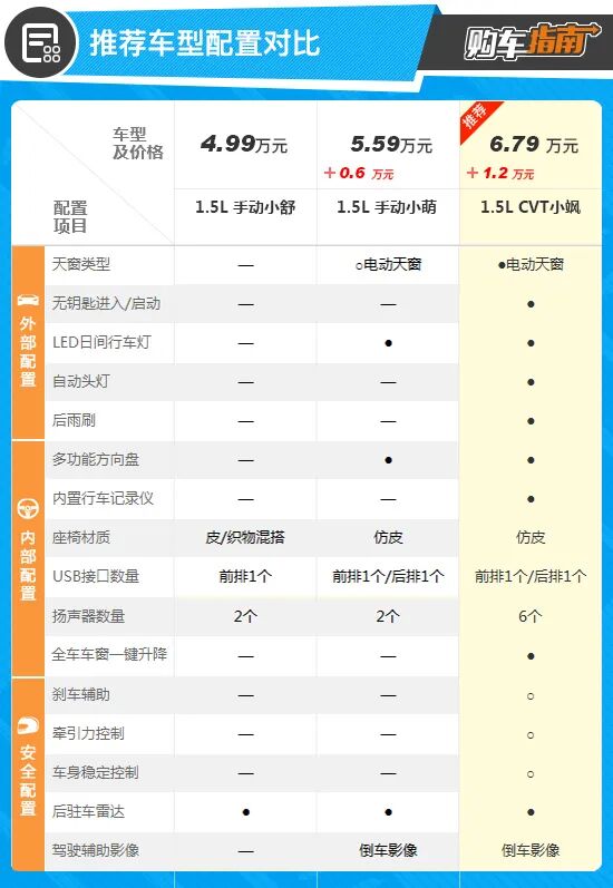 考虑到愈发拥堵的路况条件,显然自动挡车型受众更广泛一些,而睿蓝汽车X3 PRO只有顶配车型才提供CVT无级变速箱。不过不用担心,虽然是顶配车型,但售价也没超过7万元,并且在配置方面还独占如无钥匙进入/启动、自动大灯、后雨刷、全车车窗一键升降以及内置行车记录仪等诸多舒适和便利性功能,能够大幅提升用车体验。