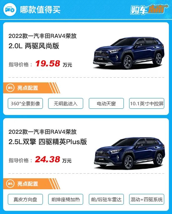 2022款一汽丰田RAV4荣放于不久前上市,共推出10款配置车型,售价区间为17.58万-26.08万元,相比于之前的车型,RAV4荣放的产品力再度进阶,成为了许多年轻家庭的购车首选。而面对众多的车型,相信大家难免会有些眼花缭乱,我们究竟应该怎么选呢?本期《购车指南》将通过外观、内饰、配置等方面为您带来全方位的解答,希望能够对您的购车有所帮助。