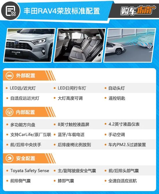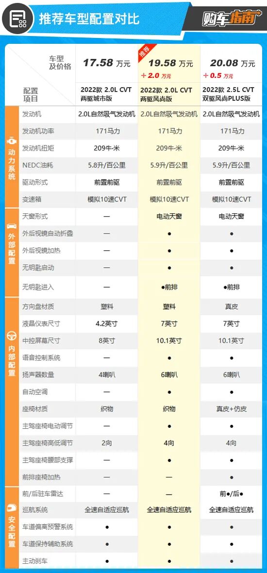 综合价格和配置等因素,首先向您推荐2.0L两驱风尚版。作为次低配版本,该车型除了搭载全套的丰田智行安全系统外,还拥有360°全景影像、电动天窗、无钥匙进入等实用功能,另外中控屏幕的尺寸也由8英寸升级至10.1英寸,性价比相当之高。而对比配置水平更高的2.0L两驱风尚PLUS版本,推荐车型也仅仅只是缺少了前/后驻车雷达、真皮方向盘、皮质座椅和座椅加热等舒适性功能,如果您对上述几项配置需求不大的话,那就没有多花5000元的必要。
