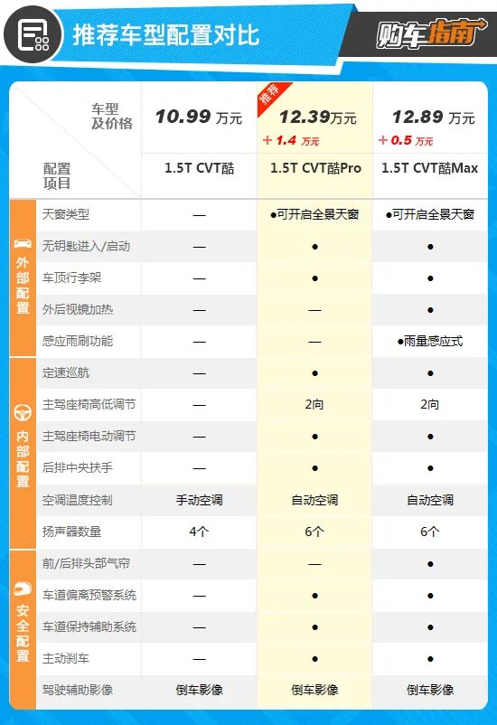 之所以不推荐入门版车型,主要原因是因为舒适性配置较少,比如现阶段新车几乎成为标配的无钥匙进入/启动和自动空调等功能,确实能提升日常的用车体验。或许你会觉得为这些配置就要花费1.4万元升级酷Pro版本不值,其实除了舒适性配置以外,推荐车型还提供了多项主动安全功能,可以在危险发生前起到预防的作用,能够为车内人员提供更全面的安全防护。此外,从整体配置表现来看,推荐车型与顶配的酷Max相差不大,除了多出的前/后排头部气帘比较实用外,其余多出的几项功能日常使用率并不高。