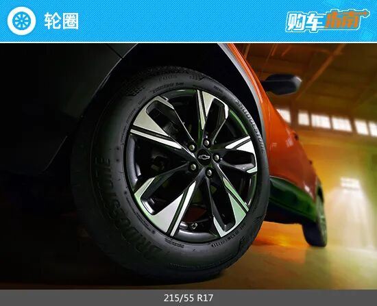 2022款上汽通用雪佛兰创酷RS全系标配镀铬和高光黑色搭配的双五辐式17英寸轮圈,时尚动感,匹配普利司通品牌轮胎,具体尺寸为215/55 R17。
