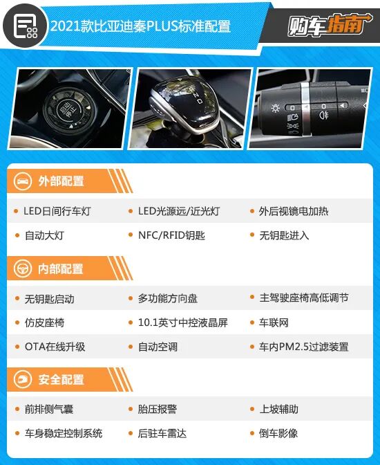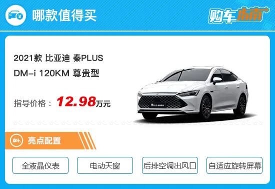 而对于120km版本车型而言,顶配的旗舰版功能更完善,无论是主动安全配置、舒适性配置还是实用性配置,表现均非常全面,不过其尊贵版之间的差价也达到了1.6万元。而尊贵版车型的配置水平其实也并没有那么寒酸,大部分常用功能,如LED前/后灯组、自动大灯、无钥匙进入/启动、NFC钥匙、电动天窗、全液晶仪表、自适应旋转的多媒体触控屏、自动空调、后排空调出风口、PM2.5空气净化装置等也均有所配备,应对日常用车需求游刃有余。所以综合来看,2021款比亚迪秦PLUS DM-i 120KM尊贵型的性价比较高,值得推荐,购车时可以优先考虑。