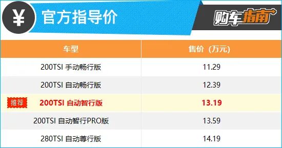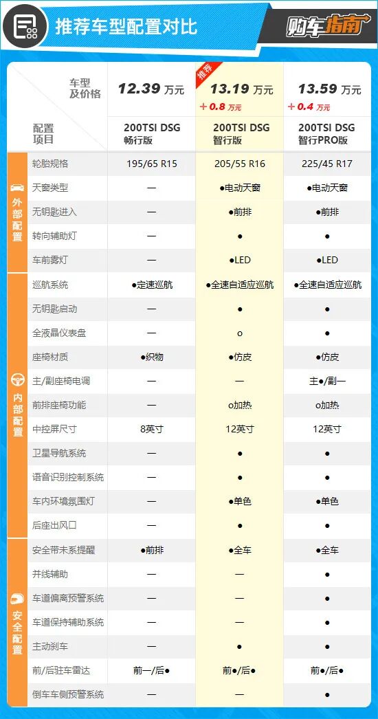 从配置来看,小编向您推荐中配车型,也就是200TSI DSG智行版。次低配车型和入门车型之间的差异主要源于变速箱不同,但配置上没有得到显著提升,性价比不高。
