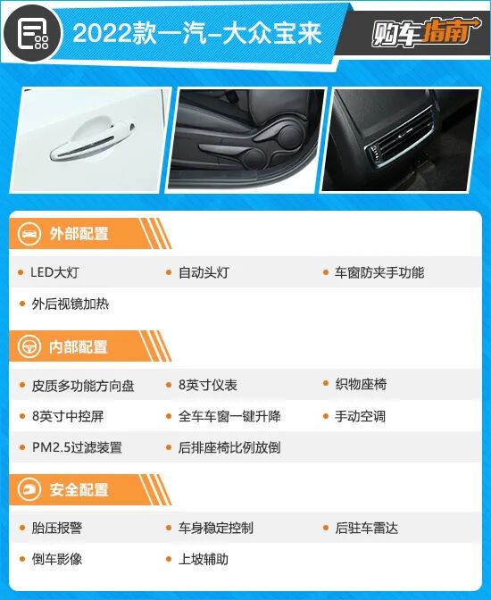 2022款一汽-大众宝来入门车型的配置表现能够满足家庭日常使用情况,并且相较老款入门车型多出了许多实用配置,例如倒车影像、定速续航、皮质多功能方向盘、8英寸液晶仪表、自动大灯、前/后头部气帘等等,而售价仅提高900元,可谓物超所值。如果您的购车预算有限,那么入门车型也是值得推荐的,不过,对于预算充足的消费者,下面这款车型性价比更高一些。