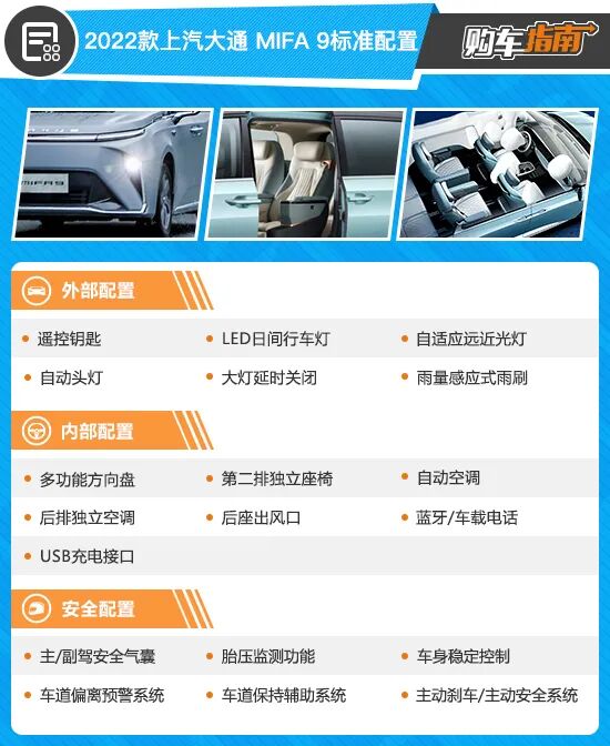上汽大通MIFA 9入门车型为绿洲7座版,售价27.99万元,这样的售价在中大型MPV中很有诱惑力,且在空间上也表现出应有的实力,但是在配置方面,该车相比高配车型确实有欠缺,例如自动空调、后排独立空调、大灯延时关闭等仅能满足日常使用,而像连体屏幕、多媒体系统等均没有配置。在安全方面,该车配备了一套自适应巡航系统,增加了行驶安全性。总的来说,入门车型虽然售价极具诱惑力,但是结合配置来看,性价比确实不高,购车时不做推荐。